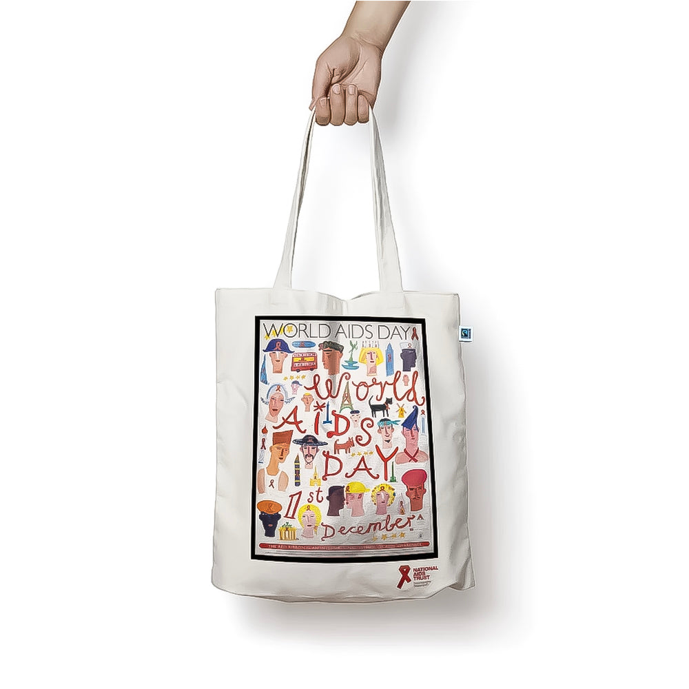 The new tote bag from the National AIDS Trust features a classic World AIDS Day poster from 1996, designed by artist Christopher Corr, printed on the front.